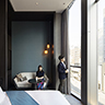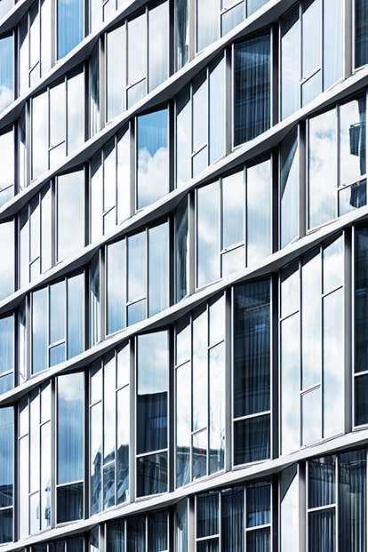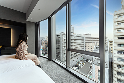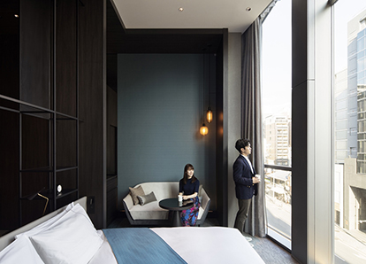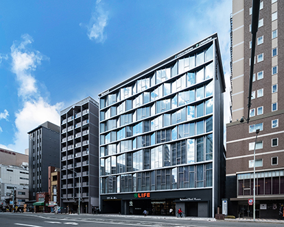 日本三大祭りの一つ・祇園祭が行われる四条通に面するホテル・物販店舗・自走式駐車場の複合施設です。奥深い敷地の特性を生かし、来訪者を奥の間へいざない、おもてなしする京町家のような空間としました。ゲストを迎える「ガラスの屏風」をイメージした外観が、まちの風景を映し込み、時の移り変わりにより多様な表情をつくることで、宵山「屏風祭」や目の前に建つ「四条傘鉾」と協奏する風景を創出することを意図しました。