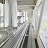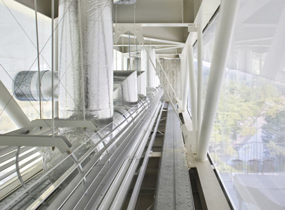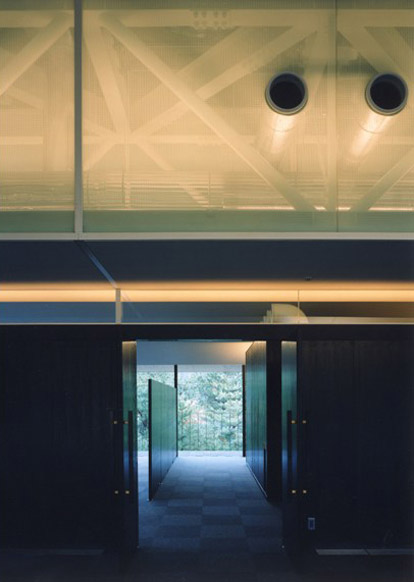 芦屋カンツリー倶楽部の開場50周年を記念して建てられたました。この別館では、建築/構造/設備の融合とプリミティブな建築の在り方をテーマとして、明るく開放感あふれるフレキシビリティの高いコンペルームを実現しています。構造体の柱をサッシュ方立として開口部周りの要素を整理し、空間の背骨となっているキールトラスに照明と空調を組み込み、インテリア化することによって、建築を構成する要素がインテグレート(統合)された、すっきりとした空間となることを目指しました。