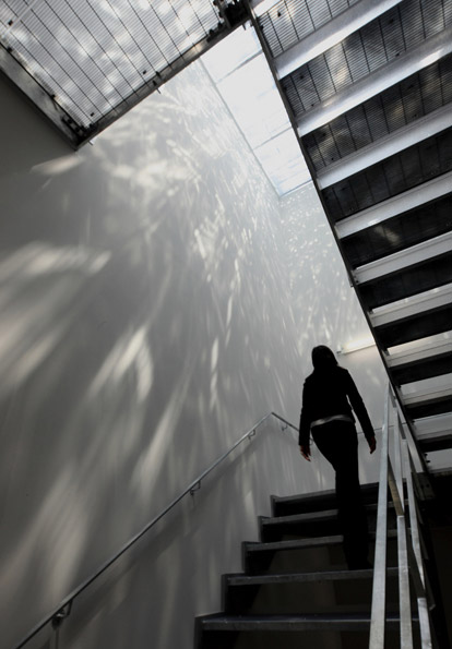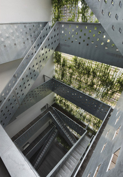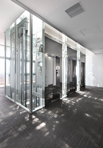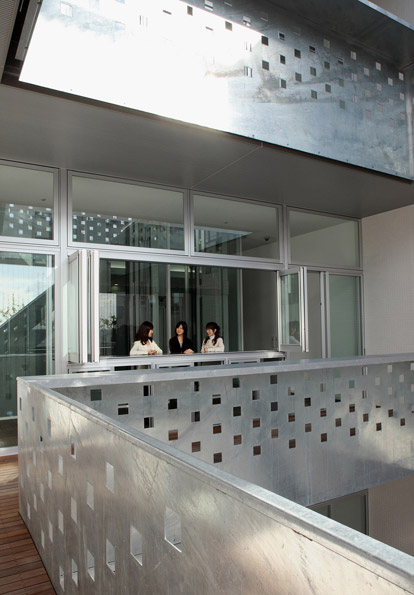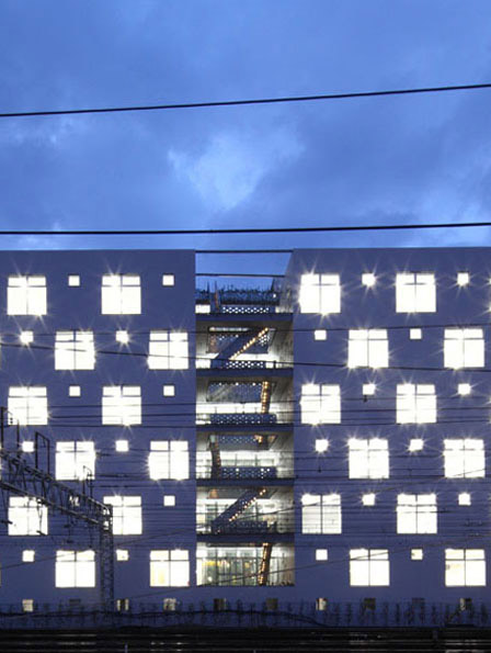 目の前の線路や北側の道路のカーブに形状を合わせた外壁は、四周を市松状の耐震壁としています。共用部に光・風・緑を可能な限り取り入れることで、ワーカーがリフレッシュすることのできる空間の実現を目指しました。