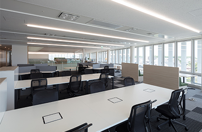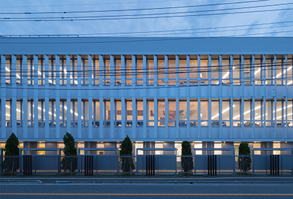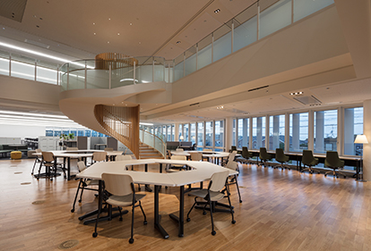 創立100周年を迎えた記念事業として計画された、設計エンジニアのオフィスです。設計室フロア中央は、木質素材を使用した吹抜空間のコラボレーションエリアで、上下移動を促す螺旋階段を配し人と人とのつながりを促進しています。設計者のクリエイティブな活動に寄与する設計開発拠点となることを目指しました。環境配慮技術の採用と⾃然エネルギーの活⽤により、Net ZEB建築を実現しています。