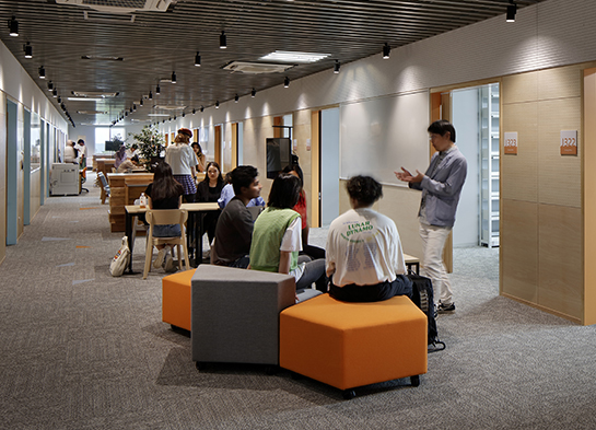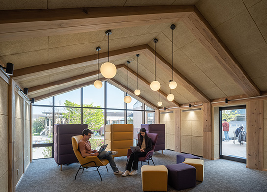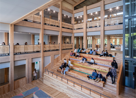 世界109ヵ国・地域(2024年5月1日)出身の外国人留学生が学生の半数を占める立命館アジア太平洋大学のサステイナビリティ観光学部新設を契機として建設した教室棟です。⽇本初の⼤規模な⽊造三層吹抜をもつ準耐⽕⽊造3階建学校(⽊三学)で、構造材の95%に⼤分県産スギを活⽤しました。⼿摺に別府産の⽵を使⽤するなど、地産地消を象徴する吹抜に学⽣・教員・地域が集い、多様な個性・活動を包み込むインクルーシブな学びの場を⽬指しました。