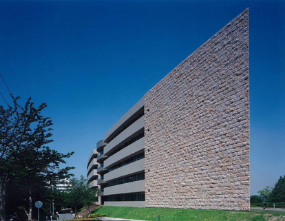 外壁は柔らかな色みの「サビ石」により福祉の色を表現し、「割肌」と「本磨き」による構成と出隅のシャープさがこの建物の特徴になっています。