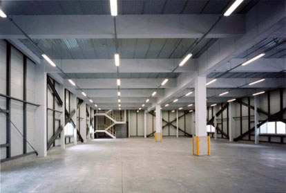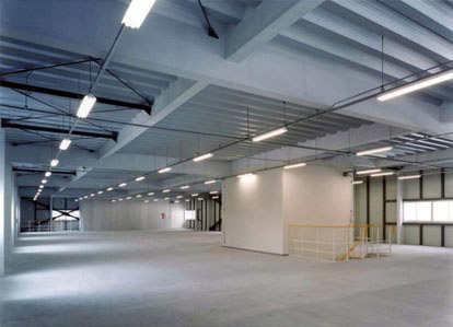 この建物は機械工具・金物を取り扱う物流商社のサテライト営業所であり、2階建の倉庫・事務所部分から成り立っています。「庇付きの倉庫」という典型的な形を打破すべく、庇上部をステンレスメッシュで覆い、夜間は投光器により前面道路に面した横長のボリュームを照らしあげています。外装材/投光器は共に建築主の自社取扱製品であり、新しい企業ID発信のあり方を提示出来ればと考えています。