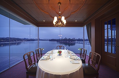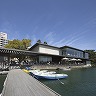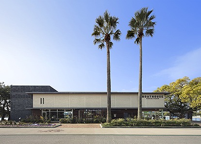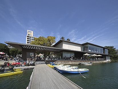 福岡市中心にある市民憩いの場「大濠公園」の水辺の一角を敷地とする飲食施設の建替えです。建築の再生にあたり、自然と共存し水景を楽しむ施設となることを目指しました。豊かな自然を背景に既存の樹木を残しながら一本の水平線(庇)を水辺に添えました。庇の上下に人々が集う場が生まれ、新たな水辺の風景が創出されました。