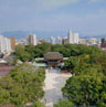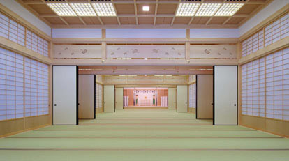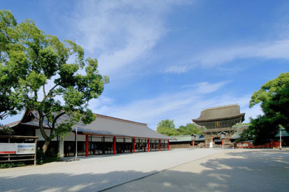 創建1080年の式年遷宮大祭の記念事業として社務所等の造営が計画されました。計画建物は社務所棟、後方諸室棟、倉庫棟で構成し、歴史漂う杜の中に機能別棟配置を行いました。伝統様式とモダンデザインの融合を図り、昔からの佇まいの有様に、軒先深く陰影のある建物としました。銅版葺き入母屋の大屋根と簡素化された軒先・柱・長押・漆喰で構成し、柱列の朱とともに、建物にシャープさと軽快さを与え、粋でリズム感のある新しい祈りの空間の創出を図りました。