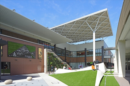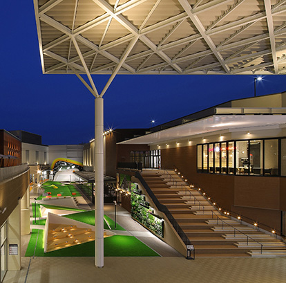 既存との間に中庭空間「ヒナタテラス」を設け、イベント可能な大庇広場、人工芝マウンド、段状客席、テラス席、噴水・滑り台等、買い物の合間に南国宮崎の自然環境を楽しめる様々な賑わい仕掛けを取入れました。
