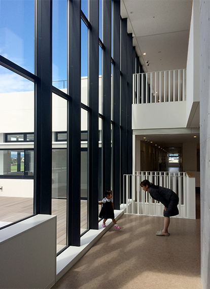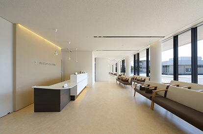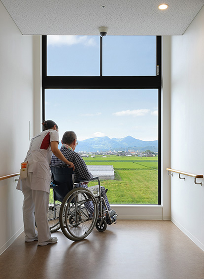 庇を設けた横連窓による伸びやかな外観に、2・3階の病棟のテラスを段々に配置することで、この地域の原風景の一つである棚田をイメージした形態としました。