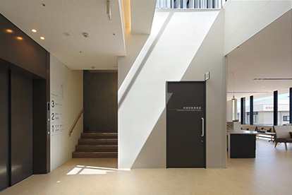 内部は土や稲穂から抽出した色でまとめるとともに、光を導く吹抜けや田園を望む廊下の大開口等、健やかな療養環境として外部とのつながりを感じられる空間を作りました。