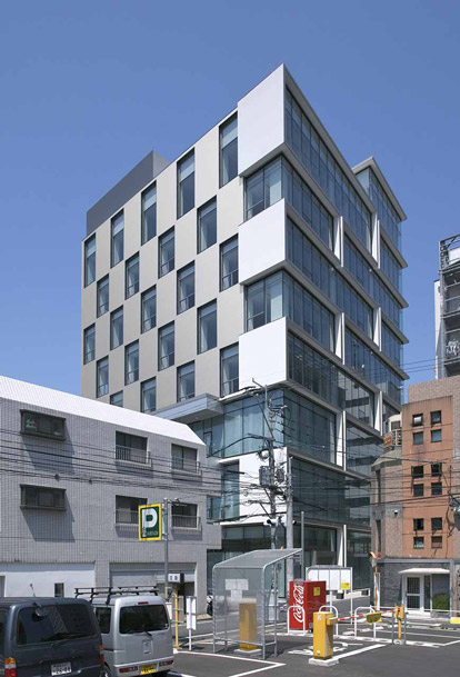 福岡の天神地区と今泉地区の中間エリアに立地する商業施設とオフィスの複合施設であることを与件として行われた事業コンペにより当社が設計施工で受注しました。2つの用途を内包するボリュームの表面に、ひとつながりのプレートを走らせ、三方に面する通りがもつ雰囲気やスケールに応答した表情をファサードに与えました。また低層部に嵌め込んだ立体的な「路地」を南北に貫通させ、新たな人の流れを生み出す仕掛けを与えました。