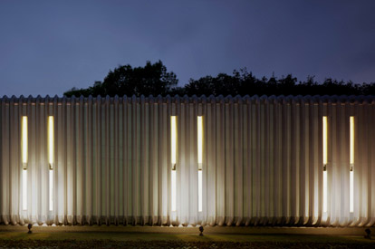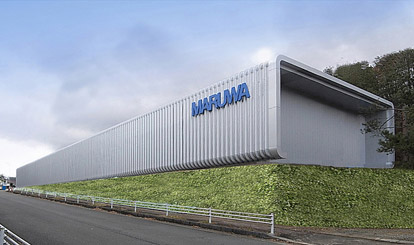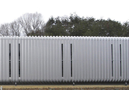 メタル折板のラジアル加工により屋根と壁を一体化し、建物長さ91mを連続させてシンプルで雄大なファサードを創りました。ラジアル加工により生じるスペースは設備チャンバーや通路に活用し、形態と機能が融合した合理的なデザインとしています。