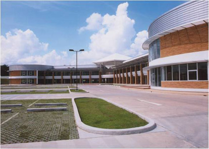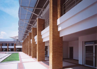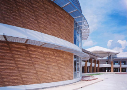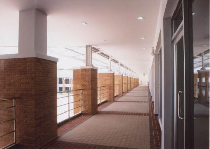 当建物は拡張を続けるタイ南部最大の工業団地イースタンシーボードの新第2ゲートのショッピングプラザとして計画され、中央のパティオを中心に左右に両翼を広げたプランとし、人々を迎え入れるような形状と、自然の素材を基調とした陰影のあるファザードにより、涼しさと安らぎを感じられる工業団地の憩いの場となることを意図しました。特に予め予定したテナントだけに留まらず、タイならではの建物内外の中間領域における多様な利用形態を促すようなゆとりと遊びのある空間構成としました。