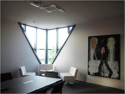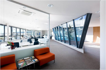 三角形平面の建物を企業イメージと融合させたランドマークオフィス