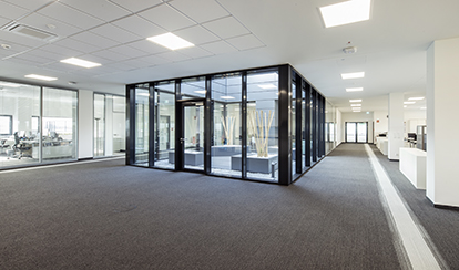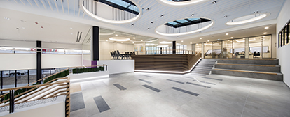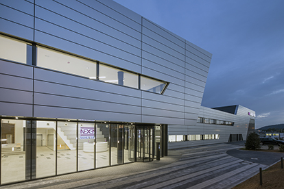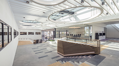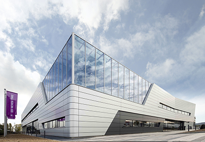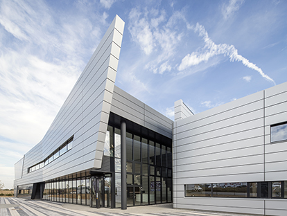 韓国のタイヤトップメーカーのヨーロッパ初のR&Dセンターです。外観はタイヤのトレッドを連想させる一筆書きの力強い表現とし、建物の顔となるコーナー部には、コミュニケーションスペースを表出させました。従業員の相互交流を促進し、イノベーションを生み出す開かれた場を求められたため、大階段でつながる大らかな広がりを持ったアトリウムを建物の中核に配し、これに面してコミュニケーションのための場を随所に配置しました。