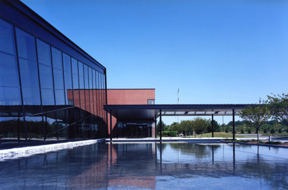 当建物はシカゴ北西郊外へ車で40分程の緑豊かなビジネスパーク内に、工作機械の販売を目的としたショールームとして計画されました。 建築主のコーポレートカラーの赤と黒を、事務所棟の赤レンガのソリッドなボリュームとショールームの傾斜した鉄骨とガラスのボリュームに表現し、同時に水上のエントランス、桜の前庭、光の中庭等、随所にランドスケープデザインを展開し、豊かな「おもてなし空間」を実現しました。