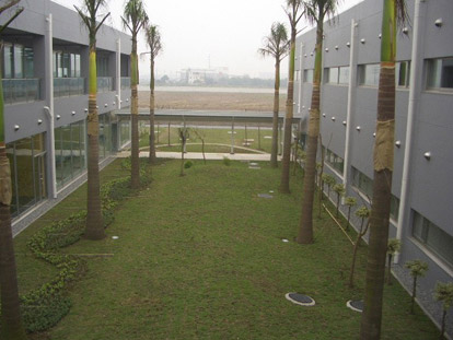 外装のコンセプトはスクエアーをモチーフとし、窓、エントランス空間、屋上庭園、消防水槽、モニュメントに展開し、一般工場とは異なるデザイナーズファクトリーを目指し、同時に工場棟、事務所棟の中間には南国風庭園を配し、象徴的な憩いの空間を演出しました。