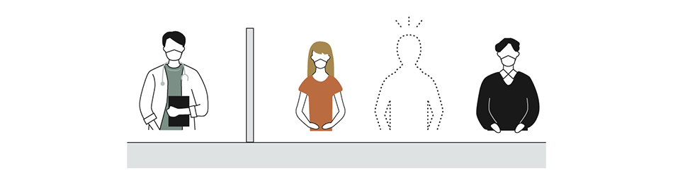 建築や家具を工夫して、患者さんや医療スタッフの動線を分けるとともに、対面での会話による感染リスクを低減します。また位置情報検知システムにより、人の密集を未然に防ぎます。