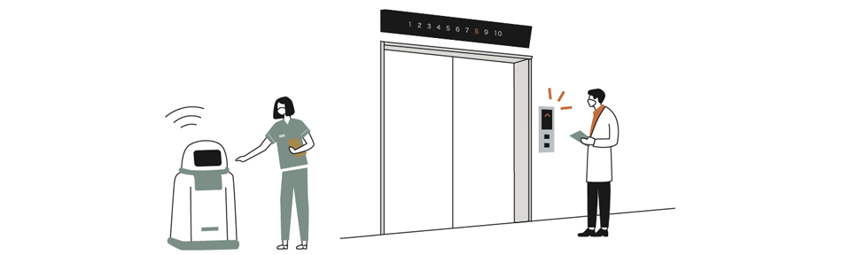 扉やスイッチなどに「触れない仕組み」を取入れ、接触感染を予防します。さらにこれまで人が担っていた業務を機械に任せることにより、人同士の接触機会を低減します。