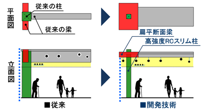 本システムは、「扁平断面梁」と「高強度RCスリム柱」で構成されており、主に免震建物で使用します。「扁平断面梁」は、梁の高さを低くし、設備配管を梁に貫通させないことで更新を容易にします。また、「高強度RCスリム柱」は、超高強度コンクリートと高強度鉄筋を採用して柱の断面積を縮小し、開放感のある室内空間を実現します。