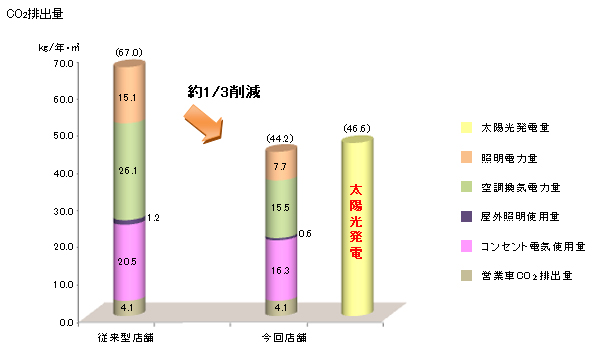 従来型店舗の年間CO2排出量(67kg/年・m2)に対し、省エネルギー技術を活用し、約1/3のCO2排出量を削減、さらに残りのCO2排出量相当分を、店舗屋上と駐車場屋根に設置する太陽光発電(86kw)によりまかない実質CO2排出量ゼロを見込みます。