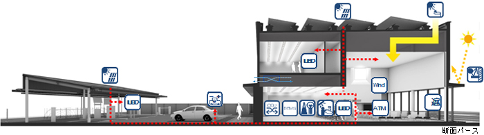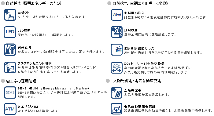 様々な省エネルギー技術を活用し、支店の営業活動で発生するCO2排出を削減し、さらに太陽光発電を導入することで、実質的にCO2排出量をゼロにする画期的な店舗です。