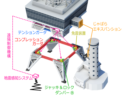 ジャッキ&ロックダンパー®は、地震時に通常のオイルダンパーとして機能するだけでなく、通常時はダンパーにロックがかかっているため、免震層の変形を抑えることができます。今回、地面に設置した地震感知システムおよび遠隔制御機構と組み合わせることで、地震発生時に、瞬時に自動でロックのON/OFFを切り替えることを可能にしました。これにより、通天閣のように高い建物において風に対しては耐震構造として上部の揺れを抑えつつ、大地震に対しては免震構造として地震力を受け流すなど、荷重に柔軟に対応することができます。