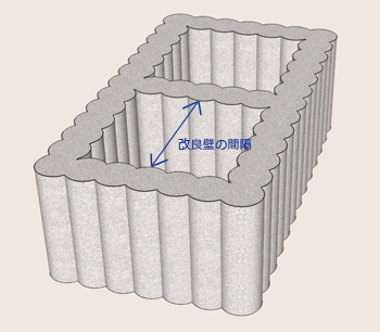 一般評定の取得にあたっては、改良壁の最適な間隔や強度を各地盤の条件から算定する設計法(特許取得済)の精度が地震応答解析と同等となるようにしました。この算定方法を用いることで、従来の設計に比べて、地震応答解析の実施や性能評価の審査に要するコスト・設計期間の低減を図ることができます。