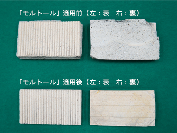 このたび開発した「モルトール」は、タイルの優れた耐薬品性に着目した、独自のタイル再利用技術です。タイルに付着したモルタルを薬液で溶解させて綺麗に除去し、色や風合いを変えることなく、タイルの再利用を可能にします。