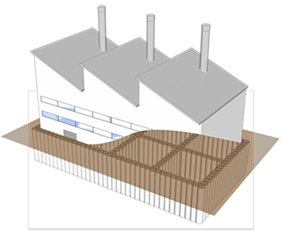 当社では、これまでに数多くの適用実績を有する液状化対策技術「TOFT工法®」のノウハウを活かした「コンパクト・ジオラティス工法®」※を2012年に開発し、既存建物、インフラ等への液状化対策に適用してきました。新開発の「コンパクト・ジオラティス工法®-矩形」は、従来は円形を柱列状に配置させていた改良体を、矩形を連続的に配置させることで、改良体の本数削減による合理化を図るものです。