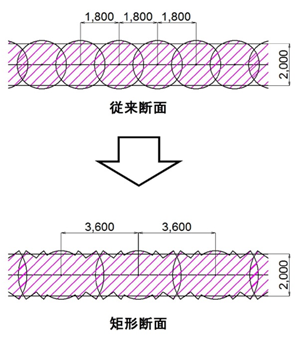- ■従来は円形を柱列状に配置させるのに対し、開発した技術は矩形の改良体を2倍の施工間隔で配置させることで、改良体本数の削減による合理化を図ることが可能になりました。
