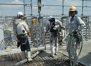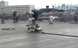 今後予想される熟練工不足に対応するため、コンクリート工事(床打設)の各工程(打設、均し、押え)に専用のアシスト機械を導入しました。