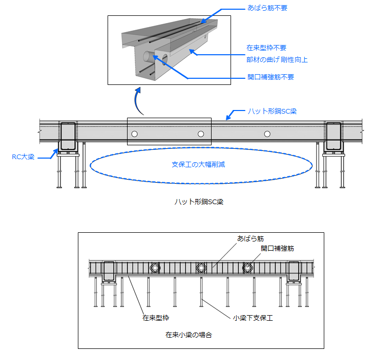 ハット形鋼SC梁は、コンクリート打設時には、ハット形鋼は型枠としての役割を果たします。ハット形鋼は通常の型枠と違い、それ自身に剛性と耐力が期待できるので、通常のRC梁打設で準備しなければならない支保工を大幅に低減することができます。したがって、直下階の作業効率・生産性を著しく向上させることが可能です。また、コンクリート硬化後は、RC梁とS梁の剛性・耐力を有効に併せ持つ合成構造として機能します。RC梁とS梁が一体となって挙動するため、単独のRC梁またはS梁と比べて居住性能も向上します。