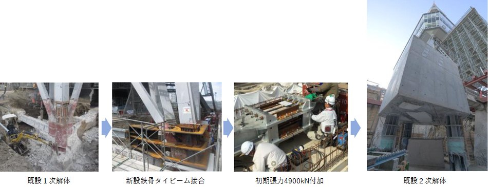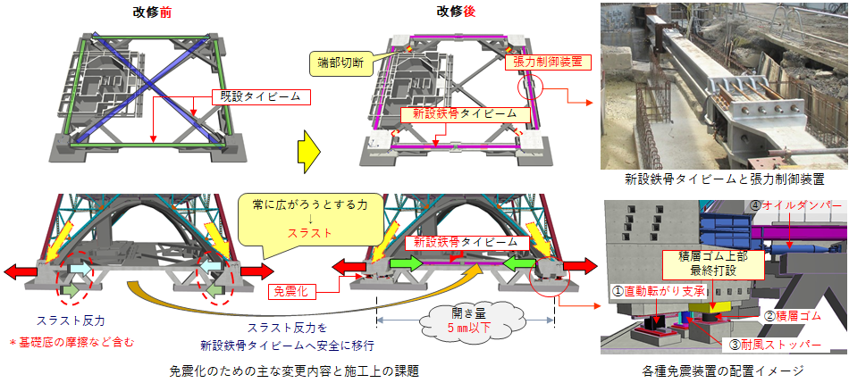 免震化の設計および監理は、株式会社日建設計(本社:東京、社長:亀井忠夫)により行われ、基礎柱脚部を切断し、免震装置を設置する工法が採用されました。これにより、基礎下面に設置の従来工法に比べ、掘削範囲など工事量を大幅に低減できるメリットがある一方で、裾広がりの形状に特有な「常に広がろうとする力(=スラスト)」を既設の基礎梁から新設の鉄骨タイビームへと安全に移行しながら免震装置を設置するという過去に例をみない施工技術が求められました。その解決のために「張力制御装置: TCD(Tension Control Device)」を日建設計と共同開発し、施工時の張力を厳密に制御しながら免震化を完了するとともに、「完成後の塔脚スパン35mの広がりを5㎜以下に抑える」との厳格な設計与条件もクリアしました。(共同特許出願済み)