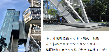 免震化により塔体は水平方向に最大50㎝程度動く設計となっています。今回、新設したエレベーター棟と本体は2~4階において斜めに接続するため特殊なエキスパンションジョイントが必要となりましたが、既成品を応用し実大実験にて性能を確認することにより実用化に至りました。