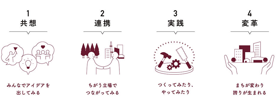 「共想」「連携」「実践」「変革」をスピーディに実現させたまちづくりを紹介していきます。また、現在はまちに実装されていないけれども、いつか当たり前の未来になるまちづくりを空想する自由闊達なコミュニケーションからイノベーションを育てます。