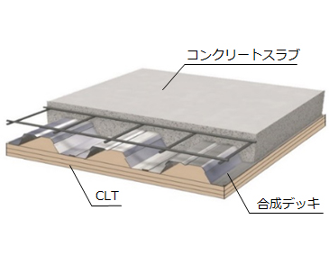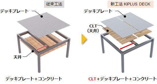 「KiPLUS DECK」(特許出願済):CLTとデッキ合成スラブ※1を組み合わせた工法。