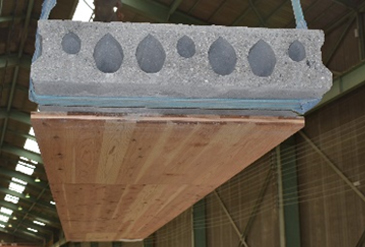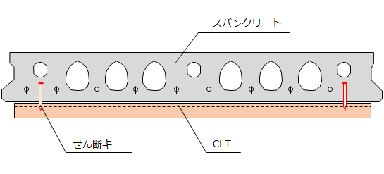 プレキャストコンクリートスラブであるスパンクリートの下面にCLTを接合した床システムです。最大で10mを超える大きなスパンを小梁なしで掛け渡すことができ、CLTの補強効果により床の変形や・振動を抑制することができます。
