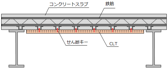 CLTの上面に鉄筋を接合し、それを型枠としてコンクリートを現場施工してスラブを作る床システムです。鉄筋が補強材となることでスパンを大きくでき、仮設を簡易化できるため、ローコスト化を実現できます。コンクリート硬化後は、下面のCLTが床の変形や振動を抑制します。