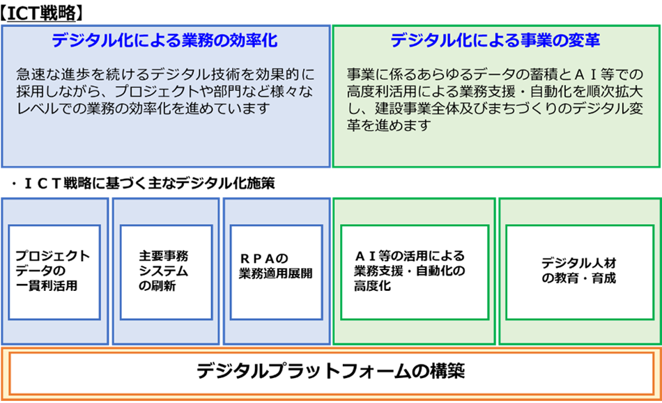 当社はICT戦略に基づき、働き方改革や生産性の向上等の喫緊の課題へ対応する「デジタル化による業務の効率化」と、グループ成長戦略の実現と更なる事業発展を目指した「デジタル化による事業の変革」のための各種施策を推進するとともに、業務及び事業のデジタル化基盤である「デジタルプラットフォーム」の構築を進めています。