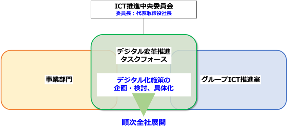 当社は代表取締役社長を委員長とするICT推進中央委員会にて「デジタル変革により2030年に目指す姿」を策定し、デジタル変革推進タスクフォースにより事業部門とICT部門(グループICT推進室)が一体となりデジタル化を進めています。全社のキーマンで構成するデジタル変革推進タスクフォースにてデジタル化施策の企画・検討と具体化を図り、本・支店に設置したデジタル化推進責任者との連携により全社に展開しています。