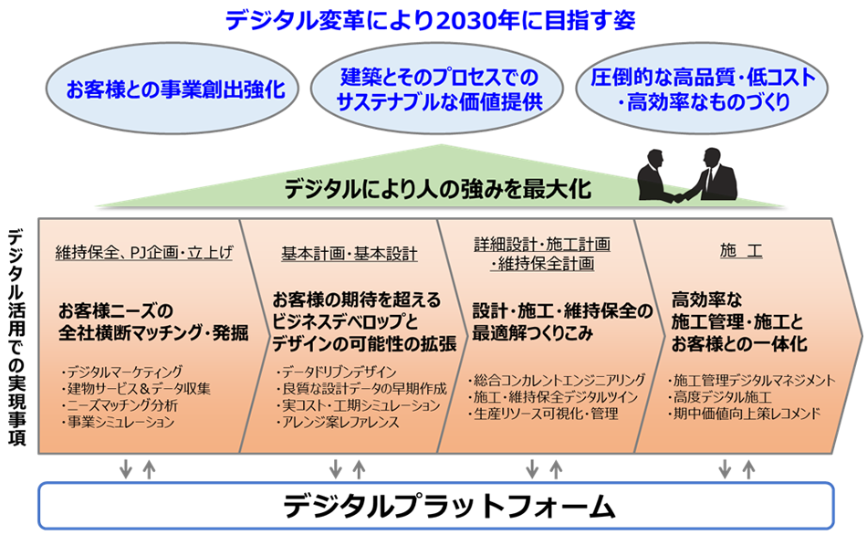 そのためには建設技術とサービスが融合した新しいソリューションを生み出し、まちに新たな価値を提供することが必要です。その前提として、当社は「まちづくり総合エンジニアリング企業」としての総合力を高める必要があります。経営資源の拡充、機能及び組織体制の整備、ICTをはじめ、人材・技術への投資等を計画的に進める中で、特に重要な取組みの一つをデジタル変革と捉え、2020年にICT戦略を改定しました。