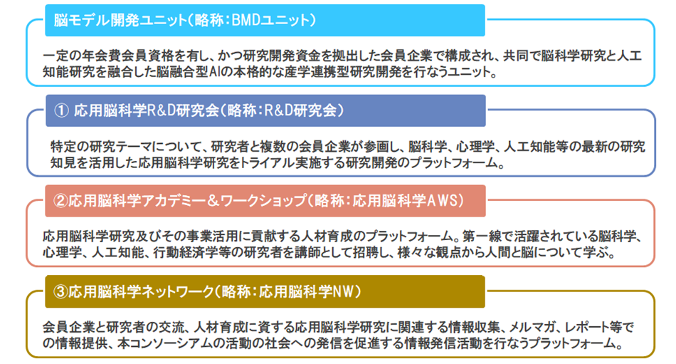 - ・日本国内において中長期的かつ継続的に脳科学とAIの融合研究の産業応用に向けた取り組みを実施し、社会的中立性の高い組織の実現を目指します。