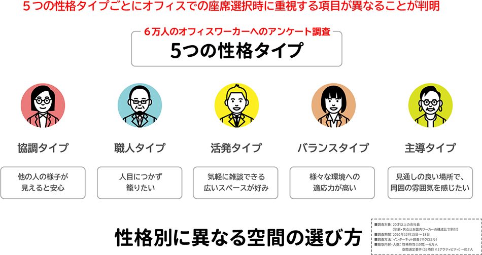 そこで両社は、「ワーカーの性格タイプが座席選択に影響している」という仮説を立て、オフィスワーカー6万人を対象としたWebアンケートを実施しました。その結果、ワーカーの性格タイプを特徴的な5つのグループに分類できることが明らかになりました。