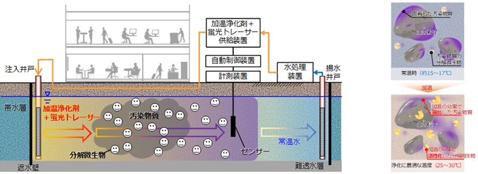 クロロエチレン類(以下、VOC)に汚染された地盤に対し、微生物によるVOCの分解がもっとも活性化する約25~30℃に地盤を加温する機能と、不均質な地盤へ加温浄化剤を均一に注入する制御機能を両立したバイオスティミュレーションに※2よる原位置浄化※3システムであり、以下の特長があります。