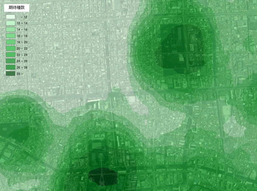 当時は、都市に生息する鳥に関する定量的な知見がほとんどなかったので、東京23区の25箇所の緑地で3年にもわたり、飛来する鳥の種や個体数などを調査しました。そこで得られたデータを統計的に解析して構築した「飛来予測モデル」を利用して、数値的な根拠をもってさまざまなプロジェクトの緑地計画を提案しました。
