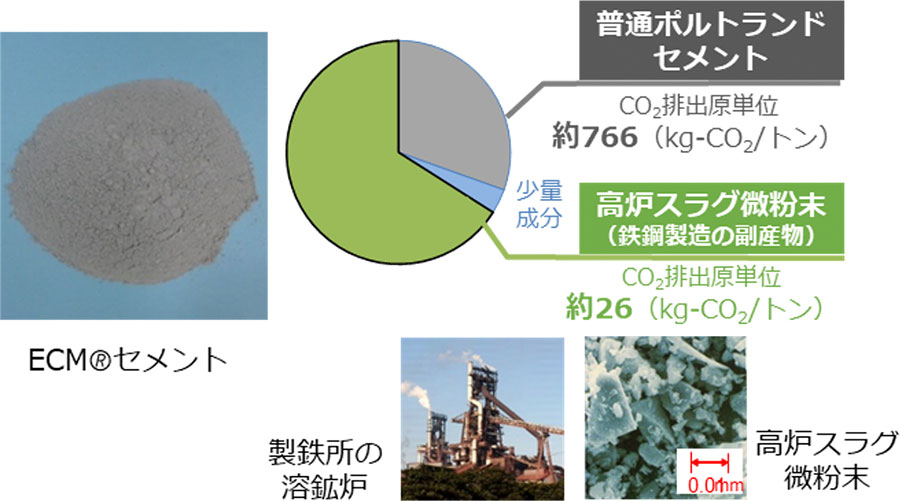 鉄鋼製造の副産物である高炉スラグを大量に使用し、CO2排出量(従来は約300kg-CO2/m³)を60~70%に低減したコンクリート
