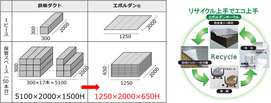地球環境への影響を小さくするため、運搬効率の高く、古紙をリサイクルしたダンボールを用いたダクトの性能向上と普及