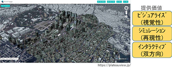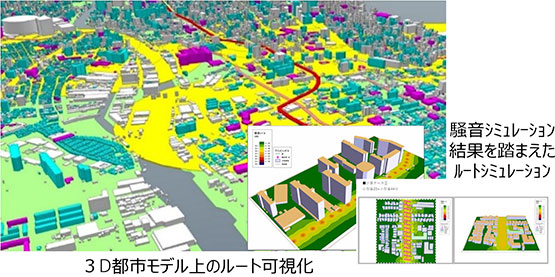 都市開発における大規模な建設工事では、地域住民の安全・安心を確保しながら施工業者の円滑な資材搬入を実現することが課題となります。都市空間に存在する建物などの名称や用途、建設年、行政計画といった都市活動情報が付与されたオープンデータ「3D都市モデル」を活用した工事車両の搬入経路のシミュレーションを開発し、地域住民の安心と円滑な工事推進を両立させます。