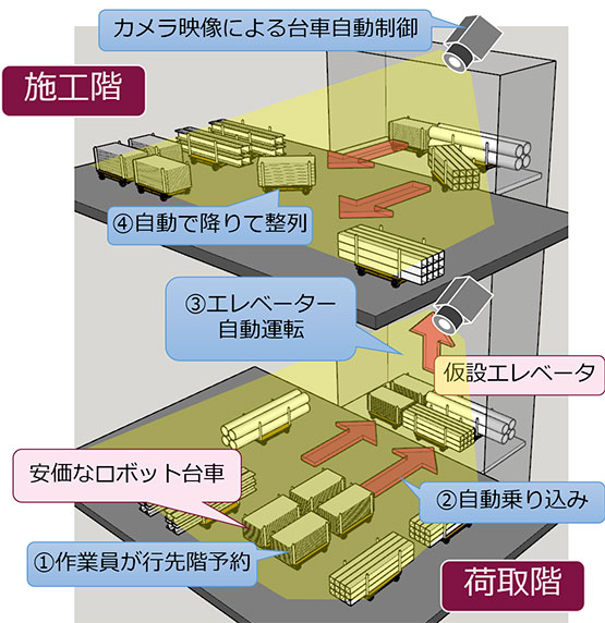 夕方台車に予約設定すると翌朝までに資材を施工階へ届けておいてくれる台車システム