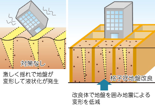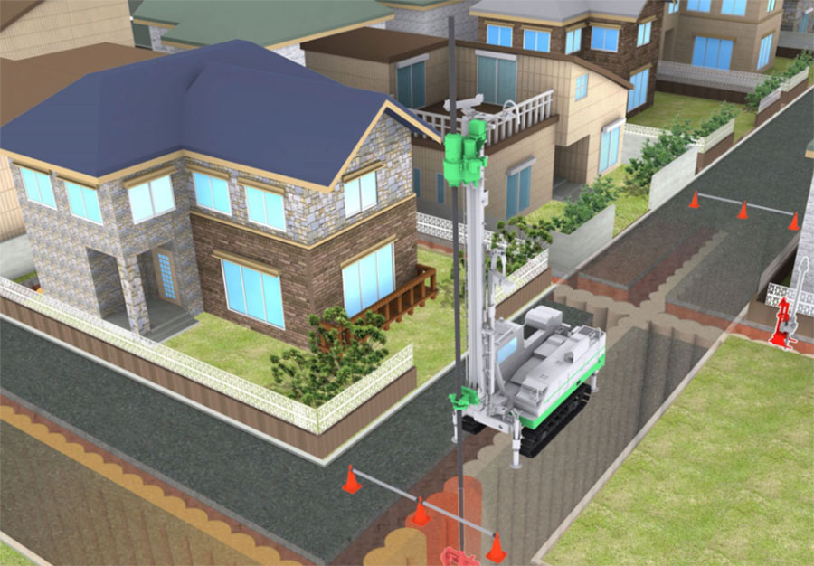 住宅敷地外周の地中を地盤改良体で囲むことで、大地震による液状化被害を大幅に低減する技術です。