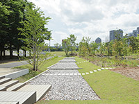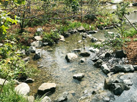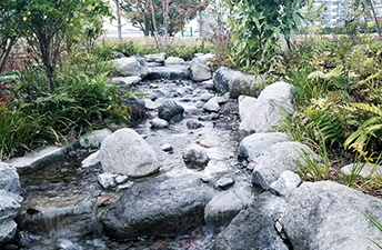 調の森SHI-RA-BE では、地域の鳥類調査によって周辺に生息する種を抽出し、敷地面積を踏まえ実現可能な誘致目標種を選定し、目標種の生息地モデルを基に樹木階層別(高木・低木)の面積・密度を設定しました。その上で、多様な植生景観をベースに、目標種が選好する実を付ける樹種を植樹したり、水浴びに適した水深の小川を設け、その周辺に利用しやすいよう低木類を植樹したり、カワセミ営巣用のマウンドを造成したりして、多様な野鳥が生息できる緑地を作りこんでいます。緑化後は定期的な鳥類相調査を実施し、結果を緑地維持管理計画に反映したり、統計的に解析することで、得られた新たな知見を今後の緑地計画にフィードバックさせていきます。